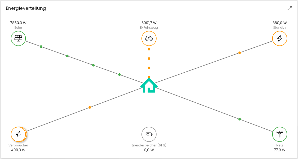 Stellen Sie Ihre Verbraucher und Energieproduktion in Ihrer Visualisierung übersichtlich dar. Zeigen Sie Zusatzinformationen wie den Ladestand von Energiespeichern oder der Reichweite von Elektrofahrzeugen an und verfolgen Sie den farbcodierten Energiefluss.