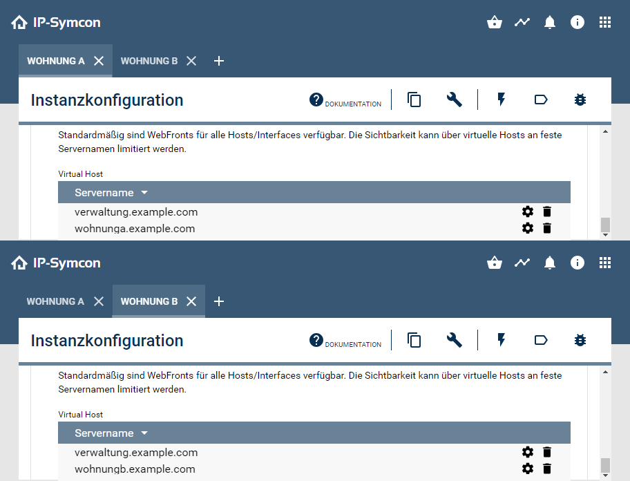 Natürlich können auch mehrere Visualisierungen die gleiche Adresse verwenden. Dadurch werden die Visualisierungen unter der entsprechenden Adresse zusammen verfügbar. So können Sie beispielsweise eine Adresse für Wartungszwecke nutzen unter welcher alle Visualisierungen verfügbar sind. Oder weisen Sie einem Ihrer Mitarbeiter mehrere Visualisierungen zu, damit er diese pflegt.