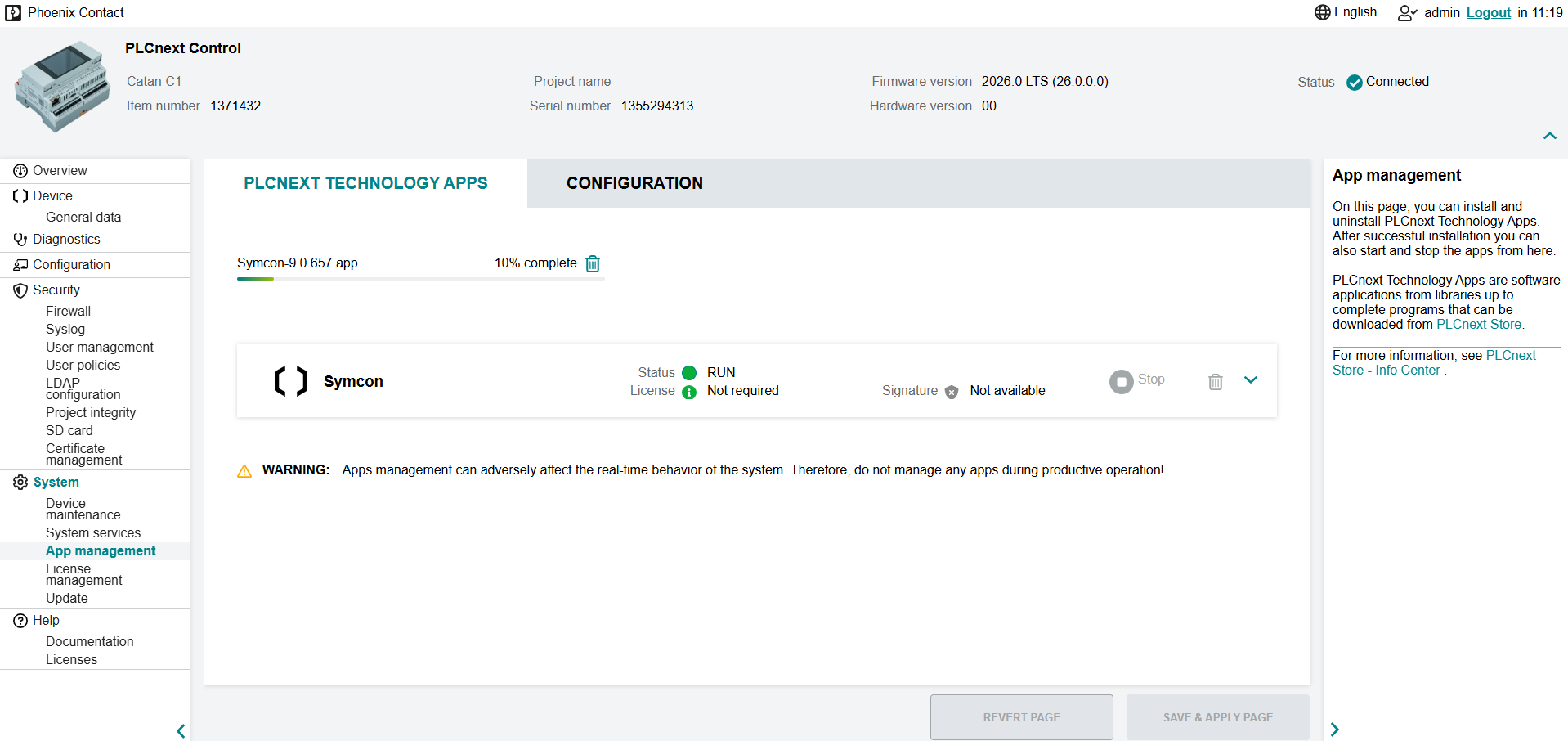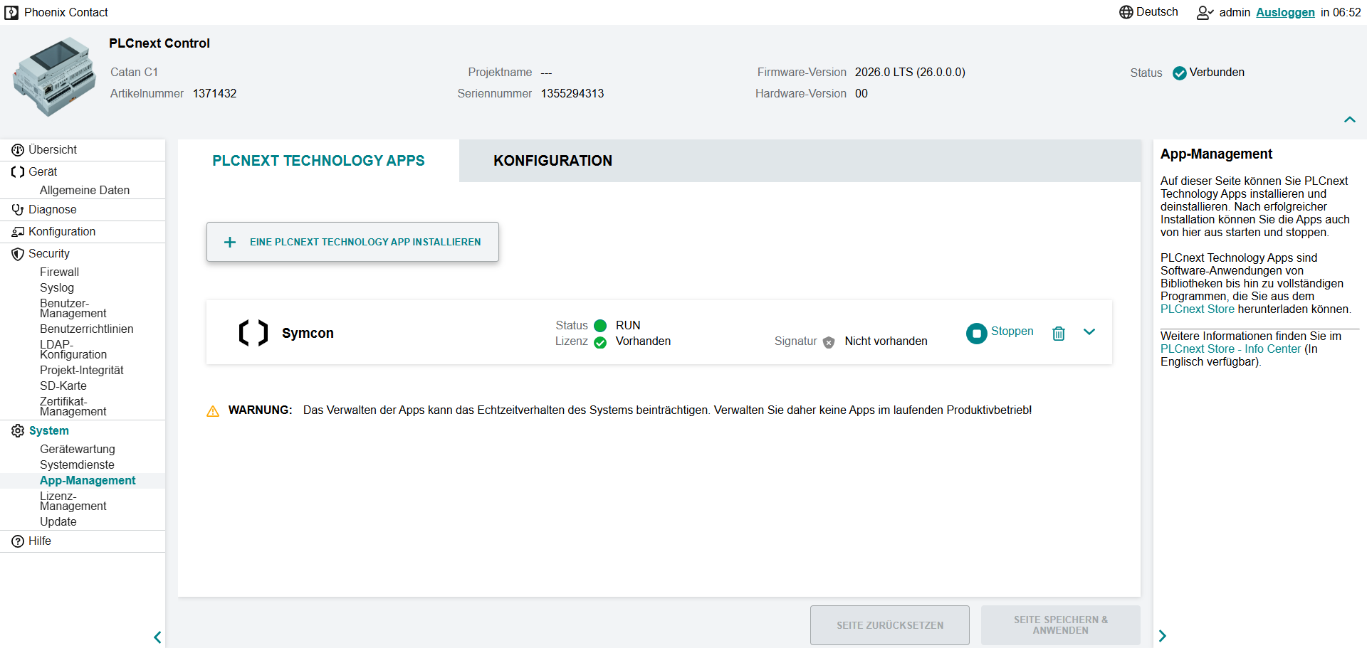 Symcon wird als PLCnext Technology App installiert. Die Installation wird im WBM unter Einstellungen -> App-Management vorgenommen. Unter Konfiguration muss zuvor die Option "Nur signierte Apps zulassen" deaktiviert werden. Nun kann die Symcon Appdatei über das mit der entsprechenden Schaltfläche installiert werden.