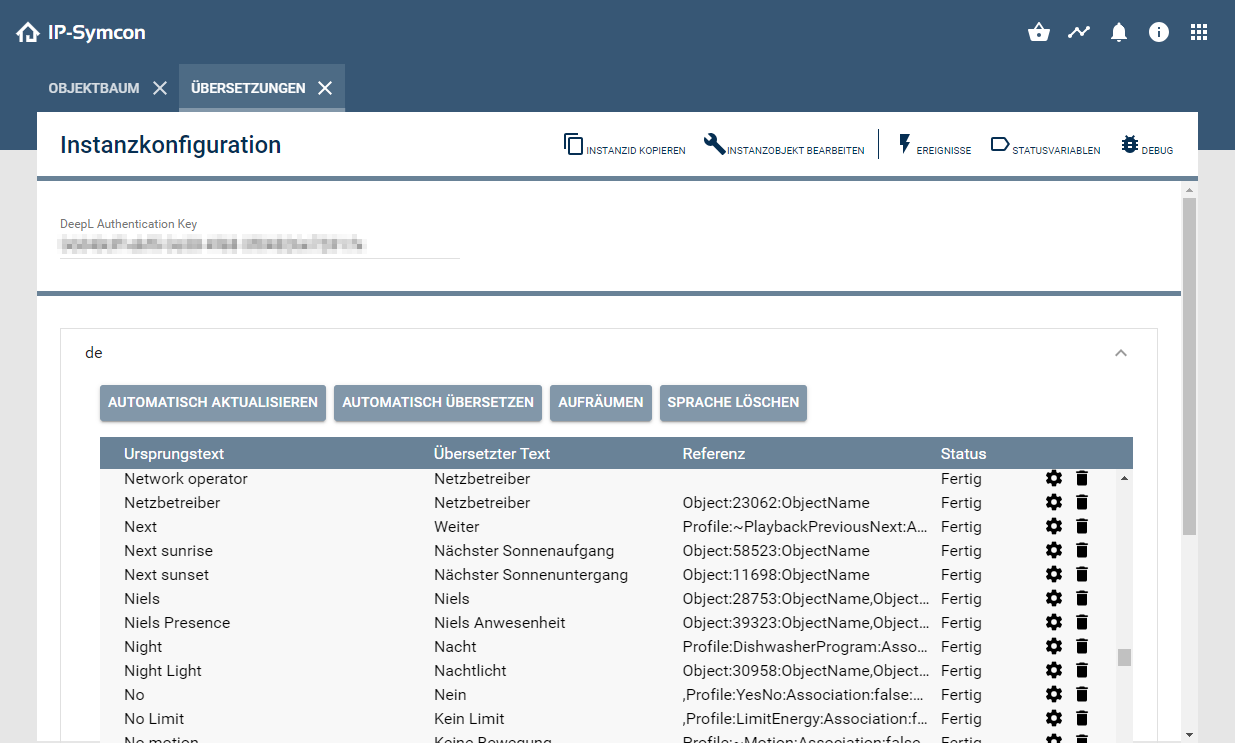 Die verschiedenen Übersetzungen können hier jederzeit angepasst werden. Mithilfe des Dienstes DeepL kann das gesamte System automatisch übersetzt werden. Hierfür wird ein API-Key von DeepL benötigt. Die Übersetzungen gelten sowohl für die Konsole als auch für die Visualisierung.