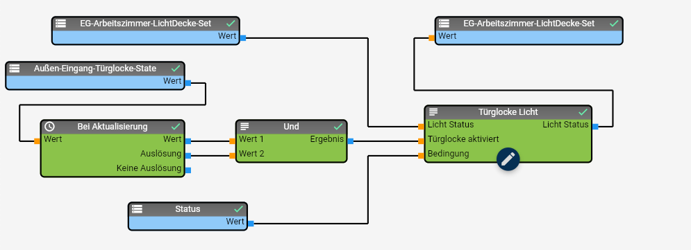 Directly after the creation, you define what starts the Flow Script. You can use triggered or timed events. For example, a triggered event can be pressing a switch or a certain temperature. The timed events can trigger all five minutes, always on the first day of a month, and much more. It is also possible to use freely configurable week schedules. Of course, you can execute the Flow Script manually at any time.