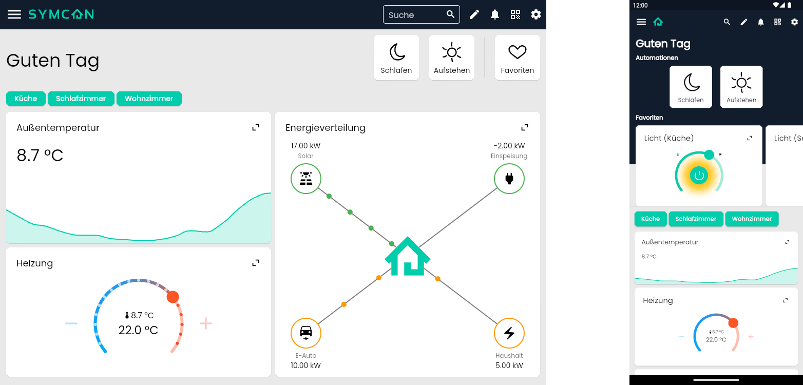 Below the appbar is the start area. The content can be changed in the instance configuration can be customized. A welcome message is displayed here by default. Additionally, a number of automations and favorites can be displayed here. For narrower screens such as smartphones, the display is slightly adjusted to make better use of the available space.