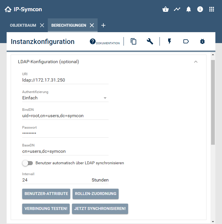 Once all the data for the connection has been entered, the user and role lists can be filled with the equivalents set up with LDAP by clicking on "Synchronize now". If automatic synchronization is activated, users and roles are synchronized at the specified interval.