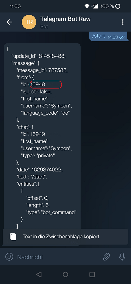 - When the bot is contacted, it returns some data, from which you can get your own userID