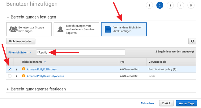 As a policy "AmazonPollyFullAccess" must be activated.