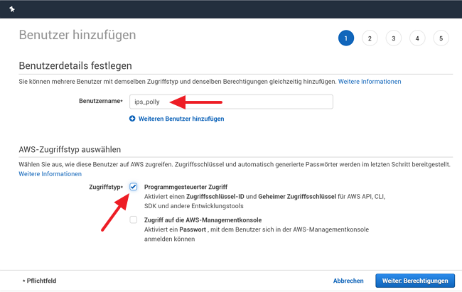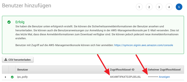 - User with appropriate Access Key/Secret Key and access rights to Polly (e.g. AmazonPollyFullAccess)